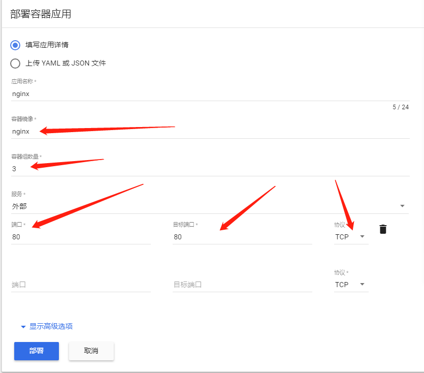 1. 这里先部署一个nginx应用,设置三个副本,对外暴露端口80