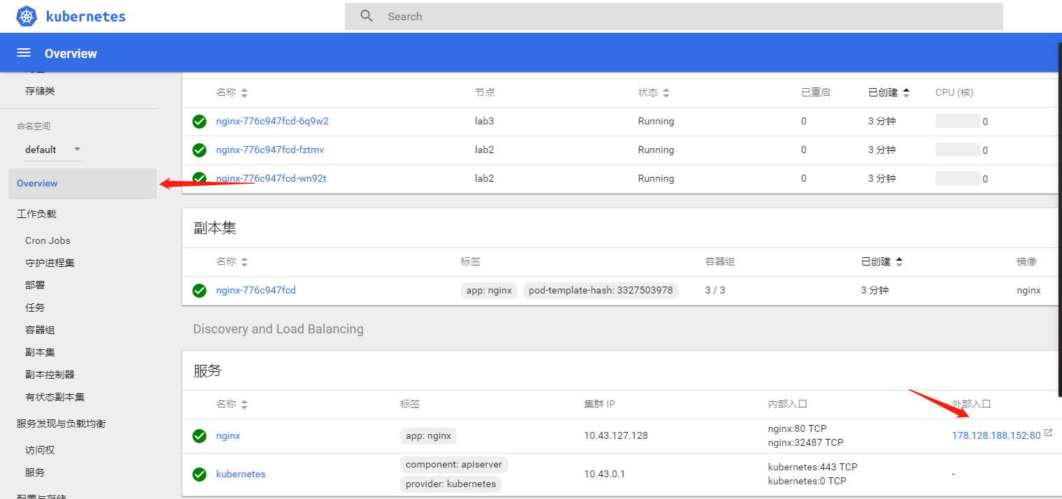 1. 等待几分钟后进入overview界面打开链接,这个时候可以看到这个,说明nginx已经成功启动并可以对外提供服务